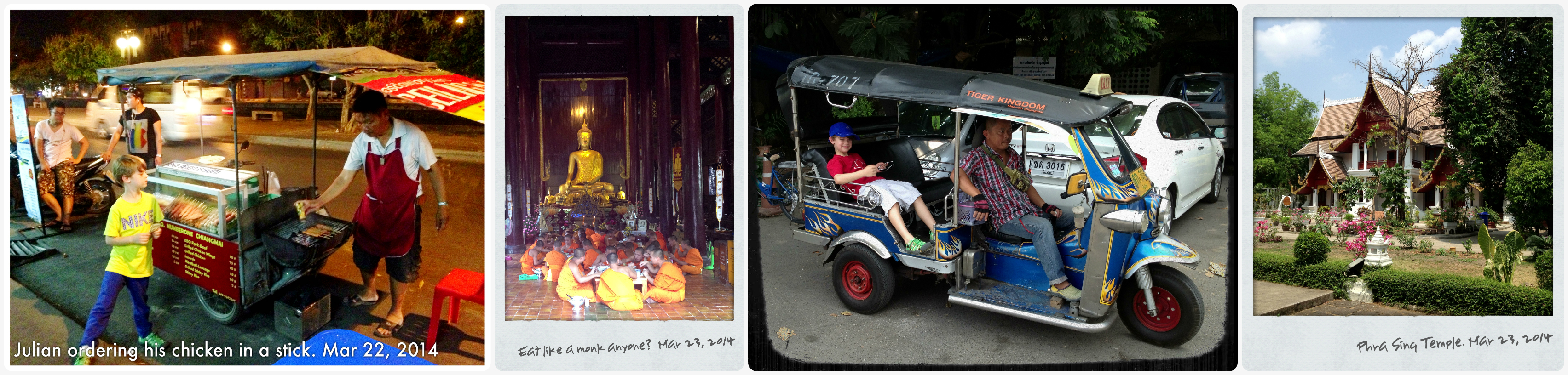 We spent a memorable week in Chiang Mai, Thailand between the days of March 22, 2014 and March 29, 2014. Chiang Mai is the second largest city in Thailand, and has a much more manageable feel than the hustle and bustle of Bangkok, especially for families with children. It is steeped in history, and popular with the veggie/hippie/meditating/trying to figure out the meaning of life crowd. Located near the mountains in the north of Thailand, Chiang Mai is a popular destination for many outdoor activities, as well as the cultural experience of the different hill tribes that live in the area and the customary temple gazing.