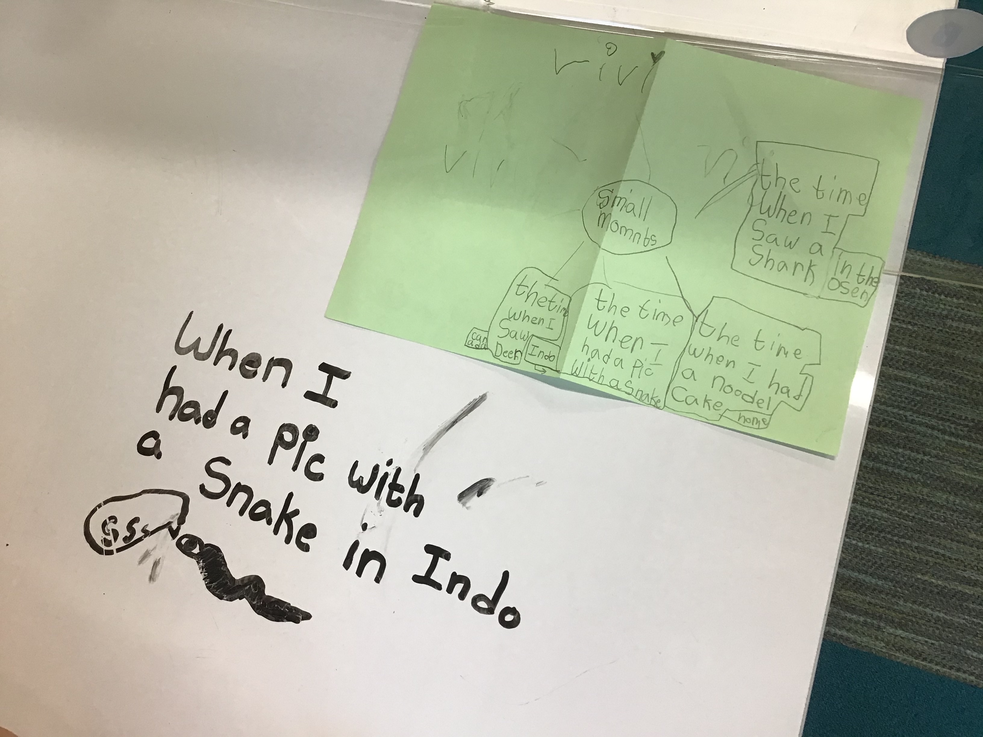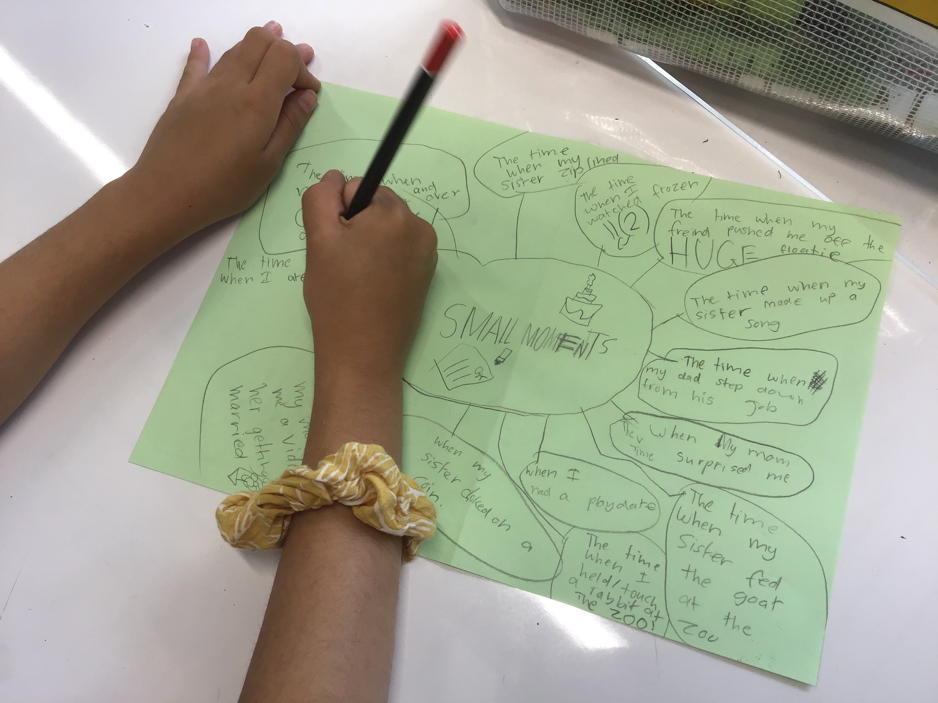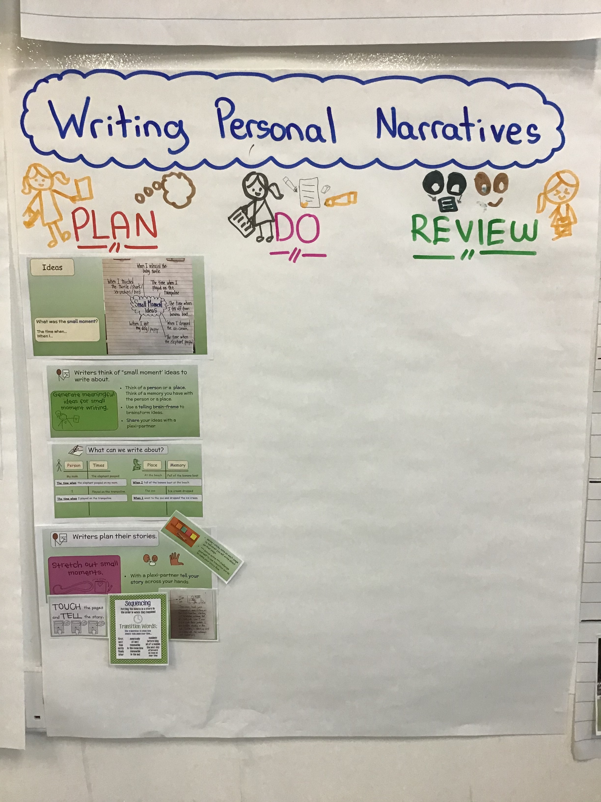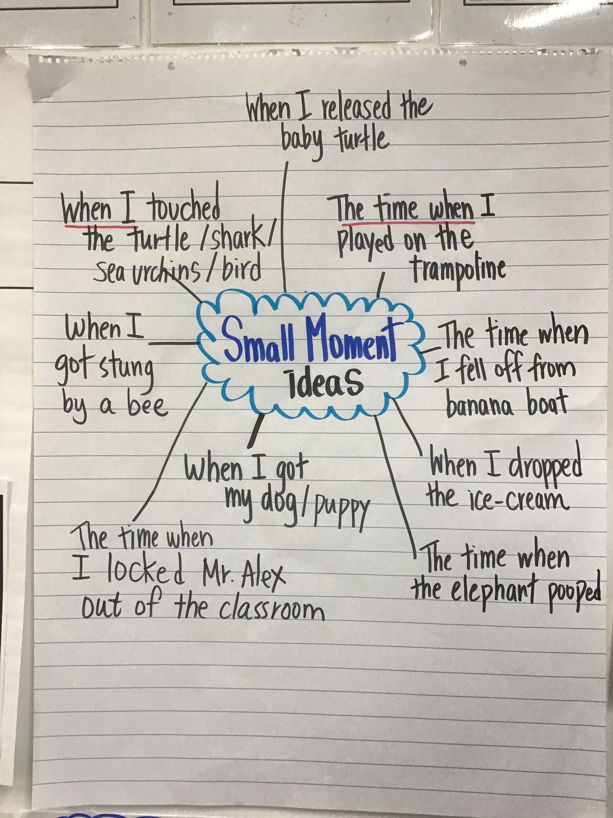 A good idea can make all the difference in the quality of the personal narrative, especially later on in the unit when it comes time to add details and really “stretch” that small moment out. So this year we decided to first invest time into unpacking what “was” and “was not” a small moment. However, prior to generating our own ideas we read a lot of small moment narratives from some of our favourite authors to anchor our thinking.