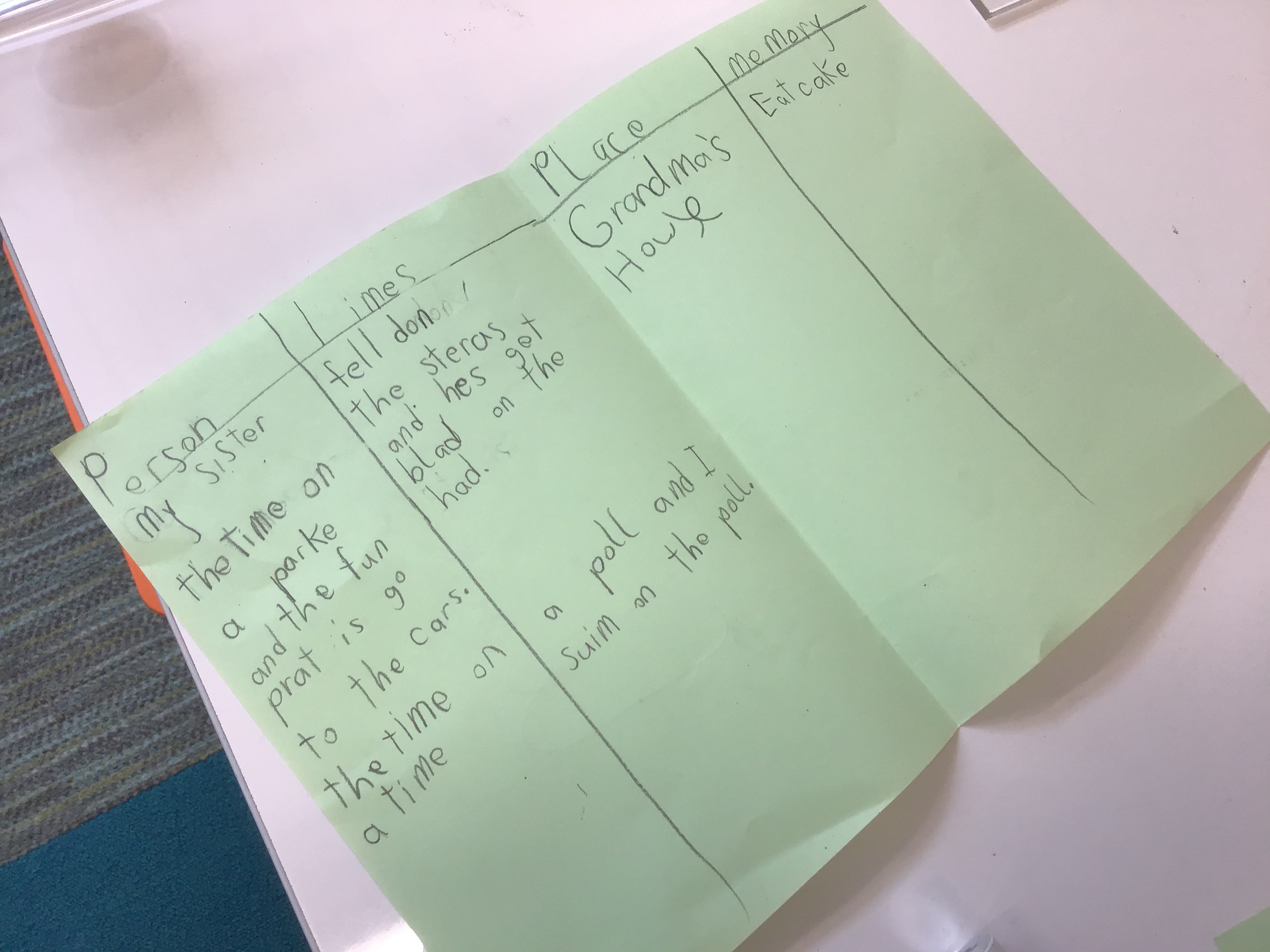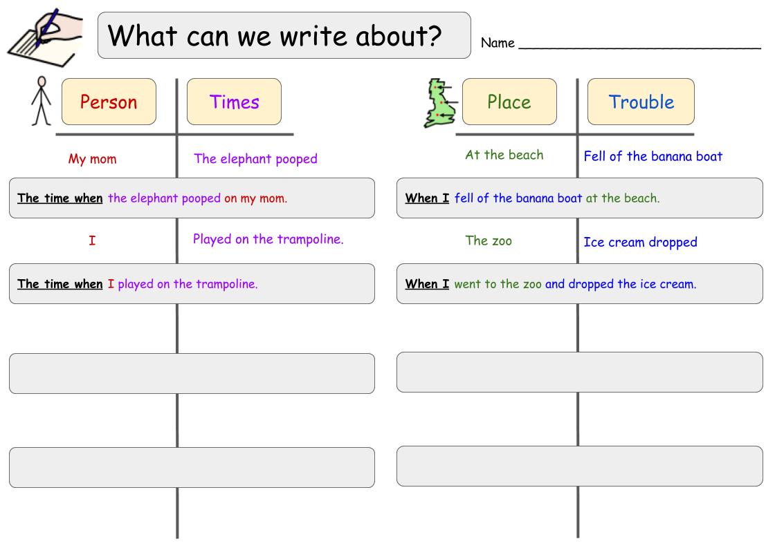 Then we started generating ideas within the framework of a person/time or place/trouble while using the sentence stems “the time when” or “when I …“