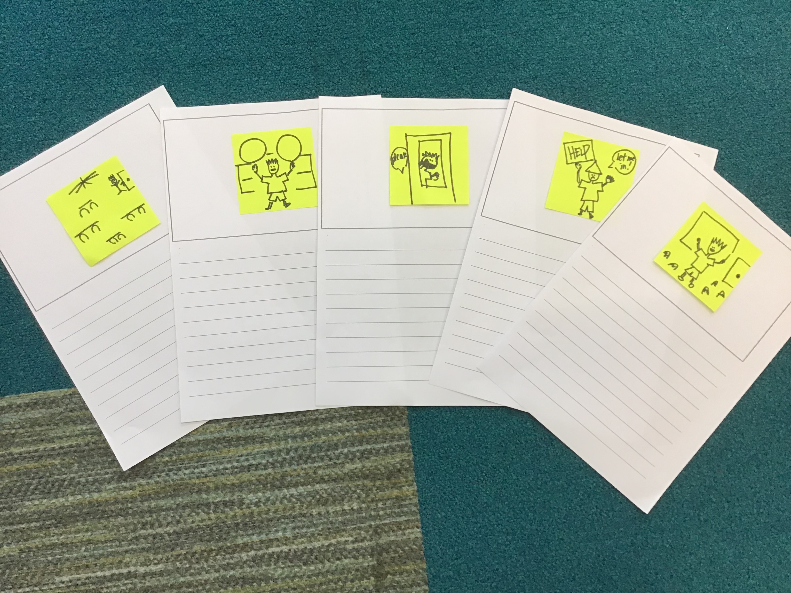 After conferring with partners (and the teacher) the students planned out their story on sticky notes to remind themselves what they would write on each page.